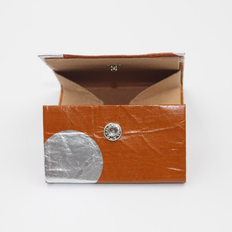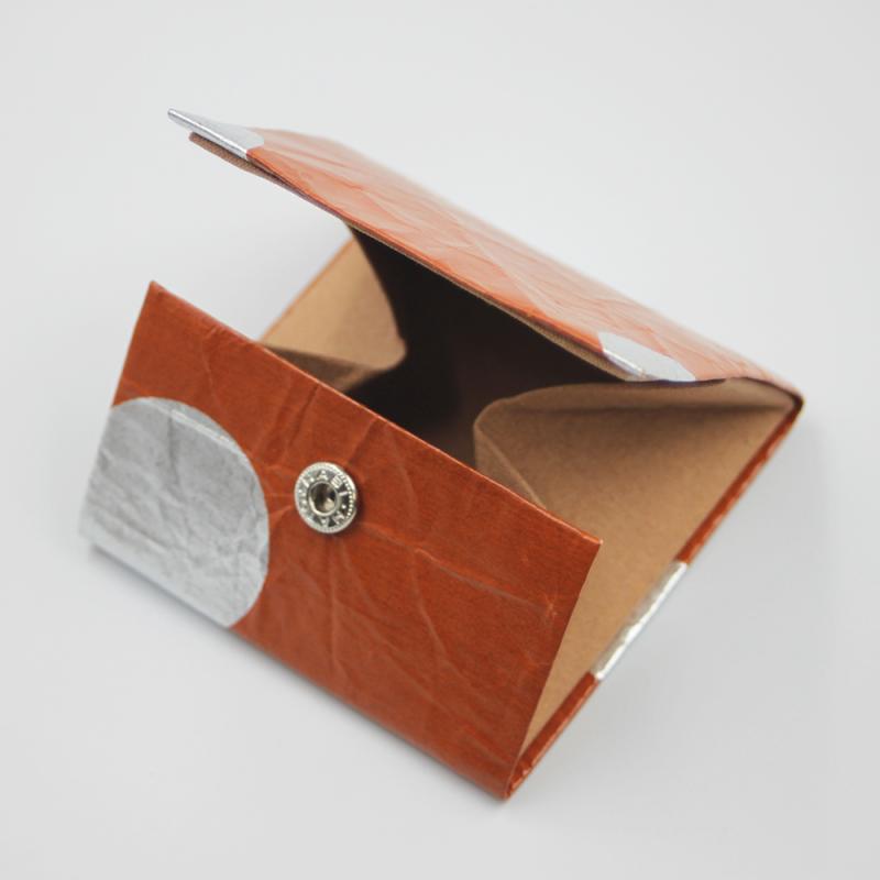 京扇子の上絵加工で培われた技術で柿渋の上に箔を付けたり、揉んだ紙に再度柿渋を塗ってシワに溜まる表情を楽しみながら、日常使いの雑貨小物へ形を変えました。